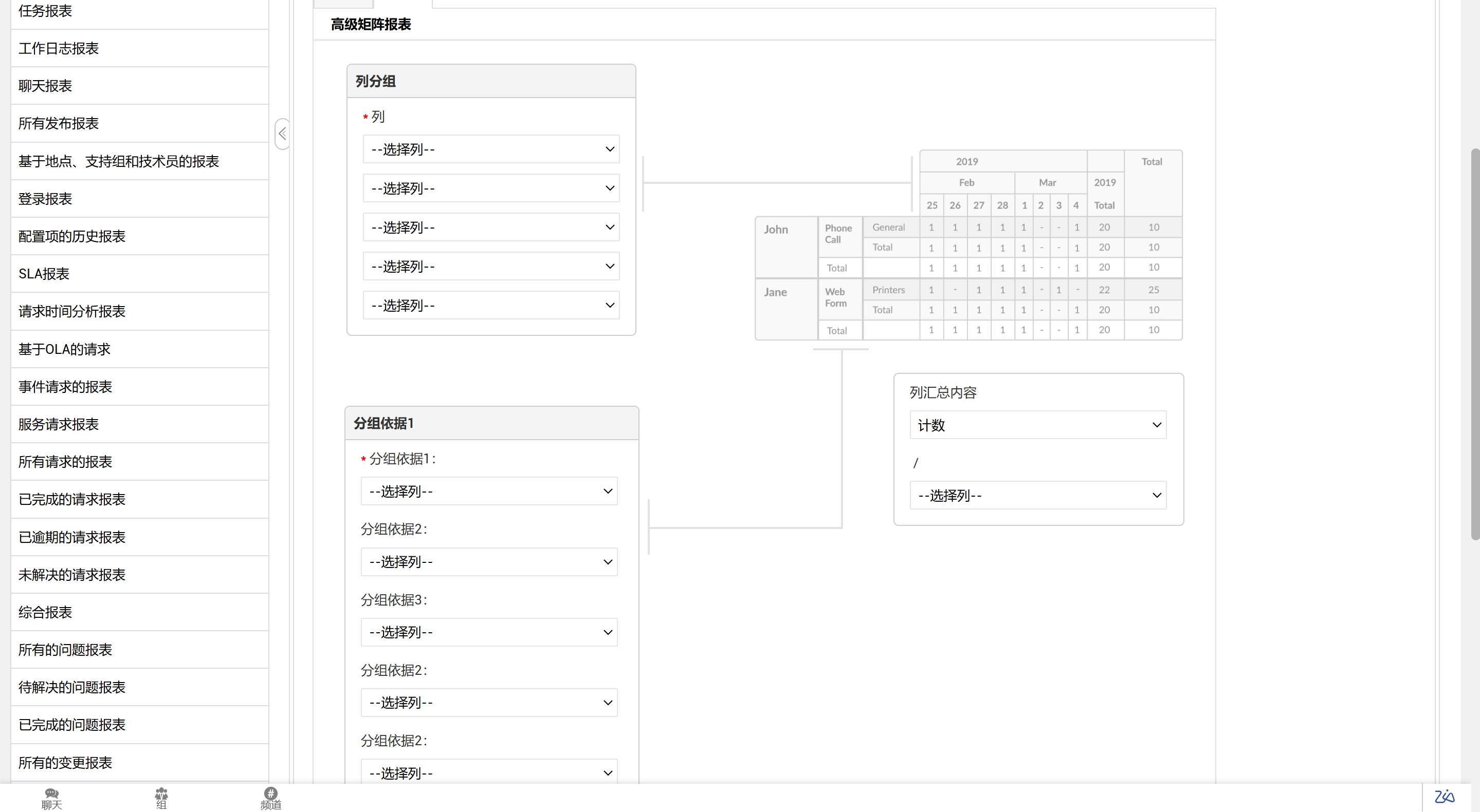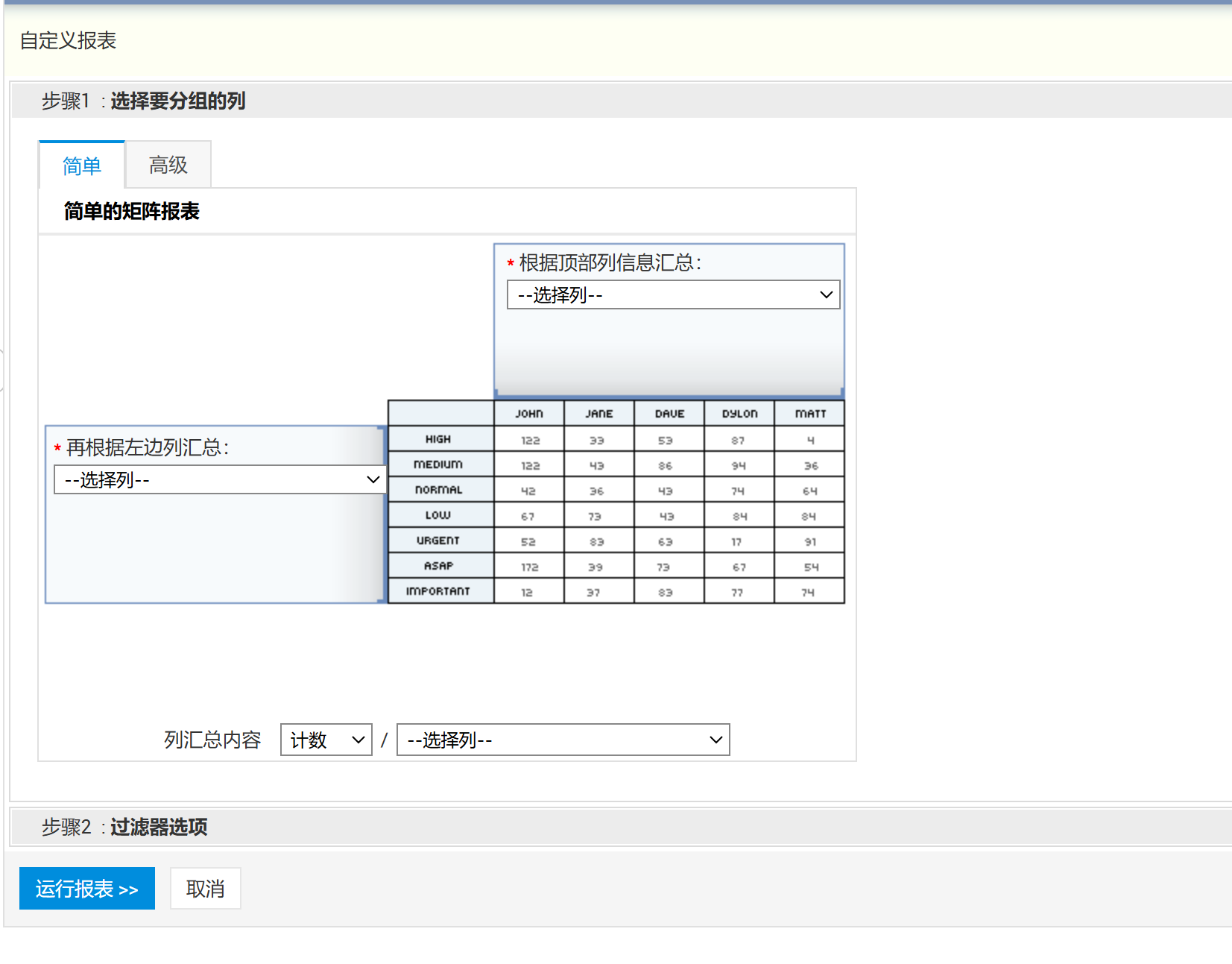 选择条件,将信息分组为行和列。 您可以通过简单分组和高级分组对矩阵报表中的数据进行分组。