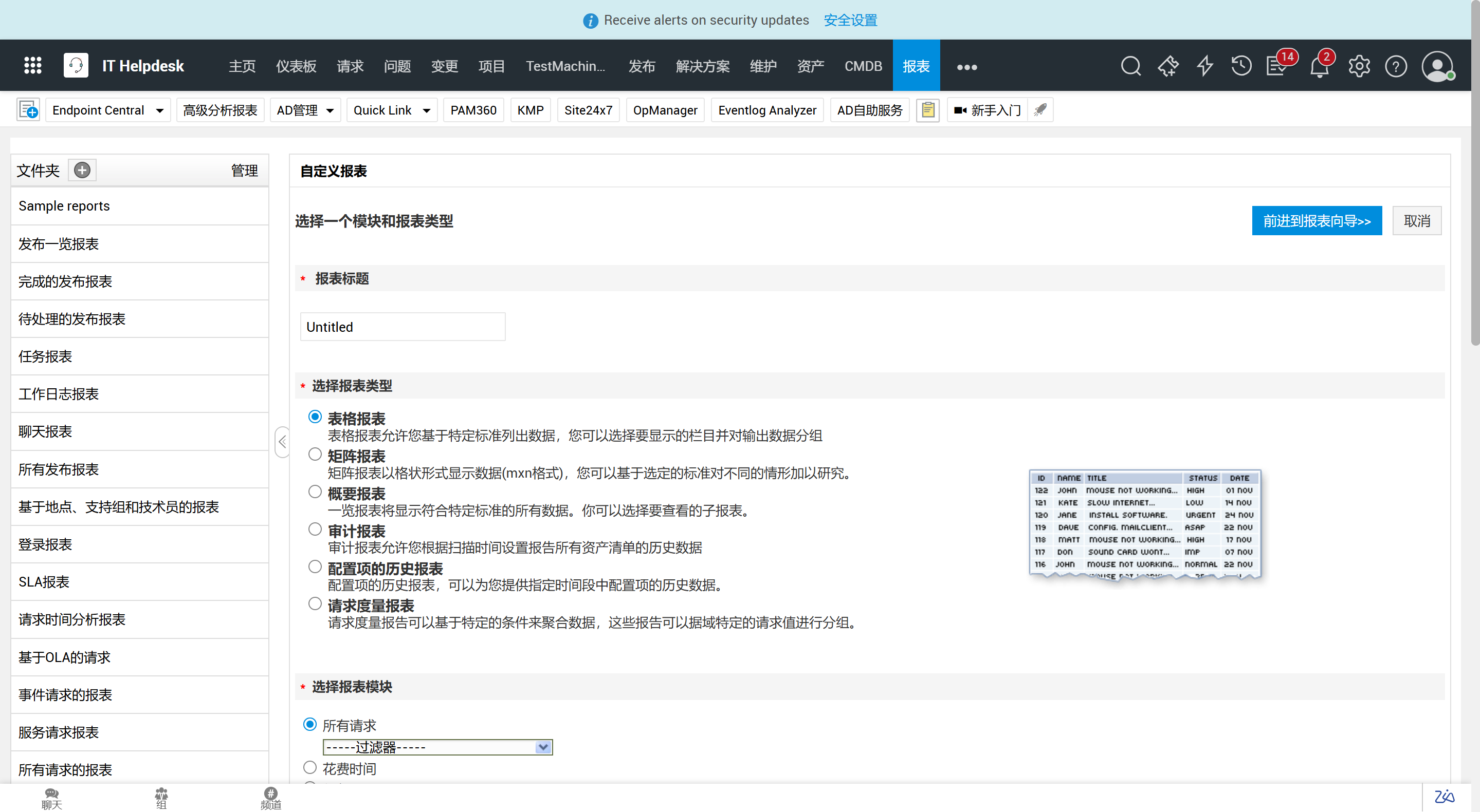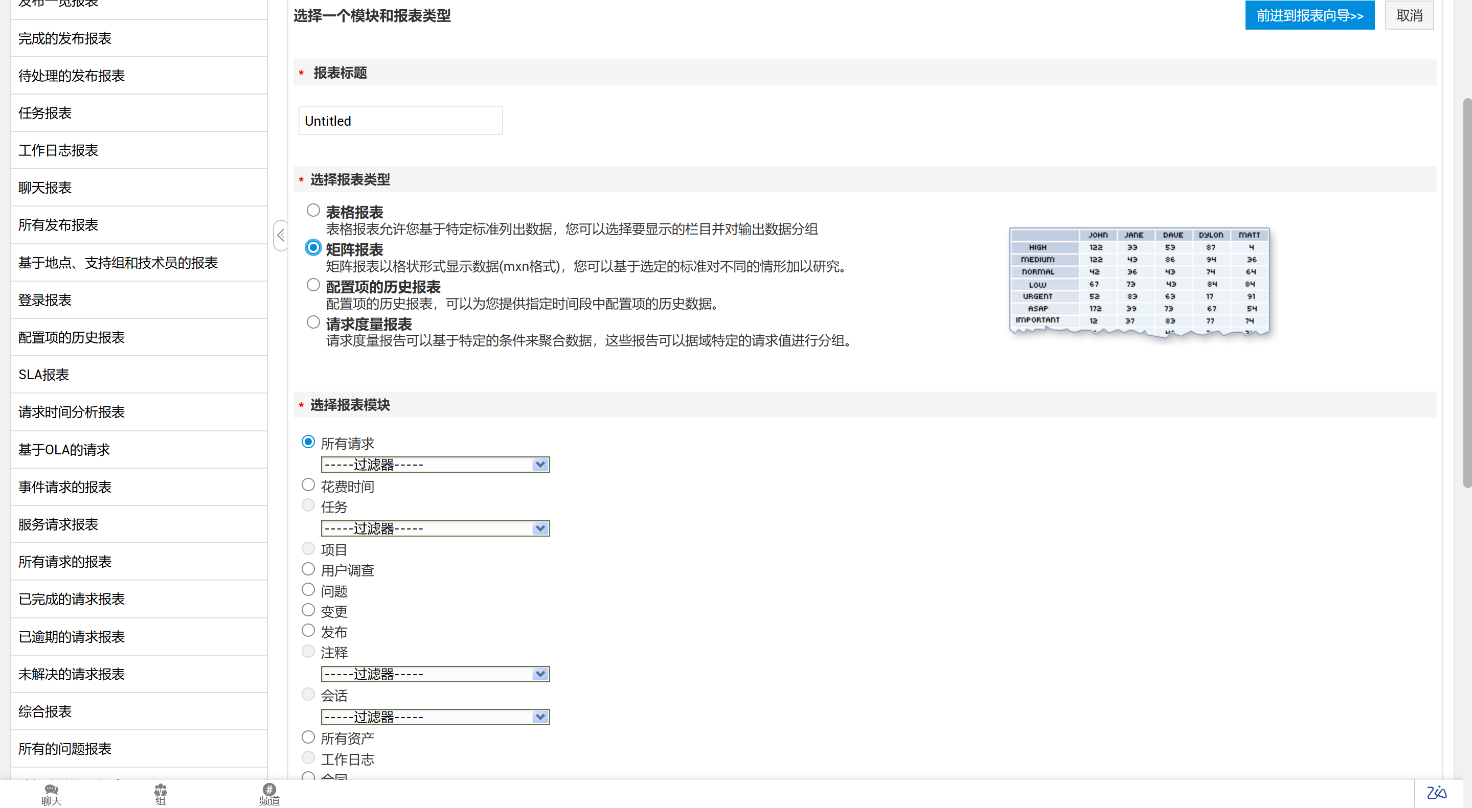 选择报表类型。您可以创建表格报表、矩阵报表、一览报表、审计报表、CI 历史报表和请求度量报表。