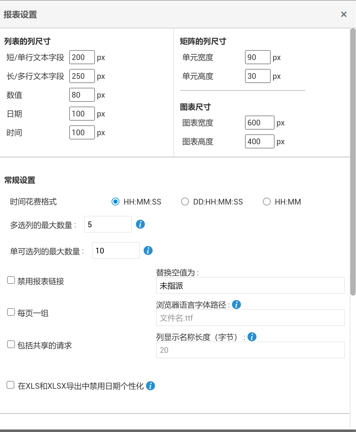 表格列尺寸 | 在相应字段中指定小文本、大文本、数字、日期和时间的字体大小。 |
