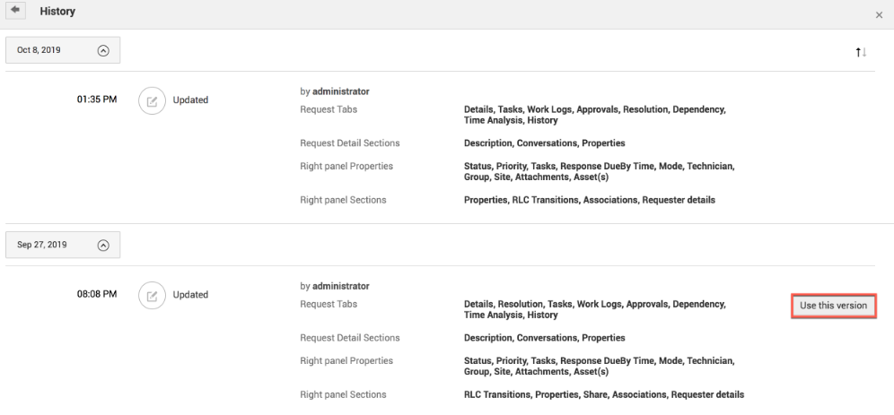 历史记录下每个布局旁边显示的 "使用此版本 "按钮可让您将相应的布局还原到请求中。
