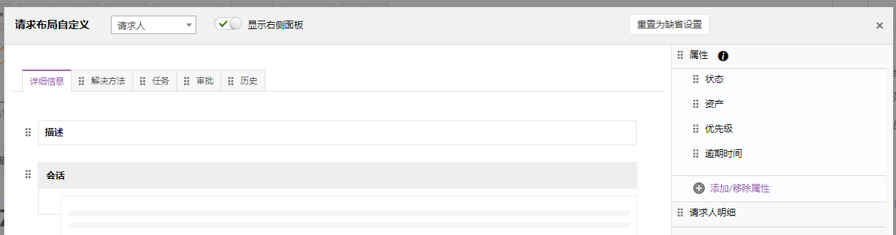 对于请求人,右侧面板默认包括请求属性和请求人明细。