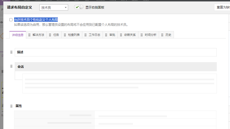 启用该功能后,技术人员可以个性化自己的请求详情页面布局。此外,管理员也可以在请求详情页面点击 >> 我的布局,为自己配置个性化布局。