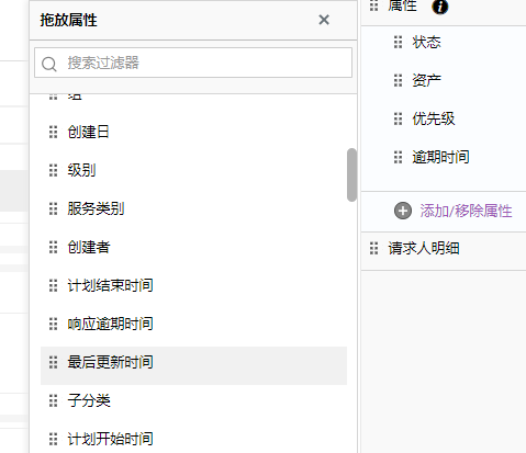 在右侧面板的属性下,默认提供特定字段。您可以添加更多的请求属性,包括附加字段。例如,"最后更新时间 "说明请求的最后一次回复是何时发出的,这对处理请求的技术人员至关重要。您可以在右面板中加入该字段。