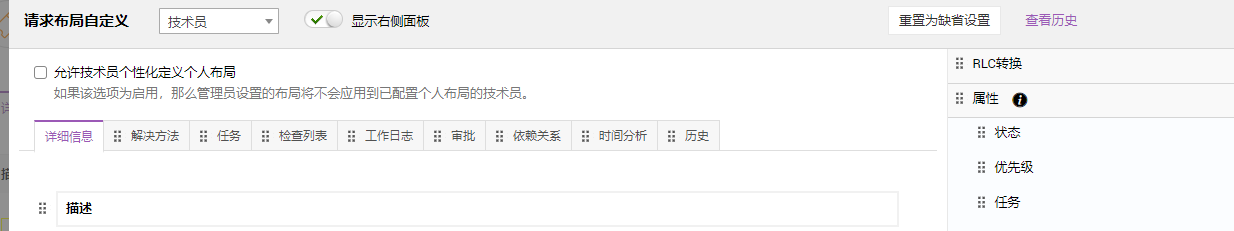 您可以允许技术员自定义其请求详情页面布局。要启用此功能,请选择复选框 "允许技术员个性化定义个人布局"。