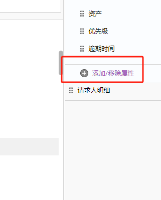单击属性分段底部显示的 "添加/删除属性"。所有请求模板的默认和附加请求字段将显示在右侧面板旁边的窗格中。但是,为特定服务类别配置的附加字段将不会出现在列表中。