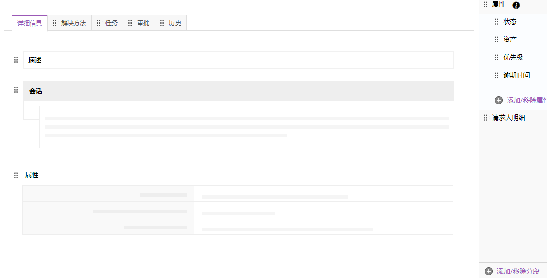 在 "详细信息 "下,您可以根据自己的要求对 "描述"、"会话"和 "属性 "等分段进行排序。例如,技术人员在接收或分配请求之前,很可能会查看请求的会话。您可以将会话放在顶部,以帮助技术人员轻松导航到该分段。