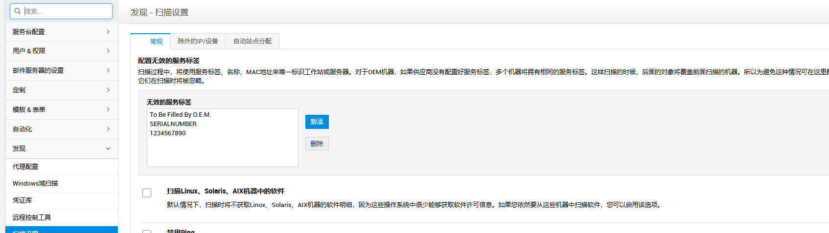 如果 OEM 没有正确配置服务标签,那么许多机器都会有类似的服务标签。在这种情况下,一个工作站会在扫描过程中被另一个工作站覆盖。在扫描过程中,可以通过在无效服务标签列表下添加这些服务标签来忽略它们。