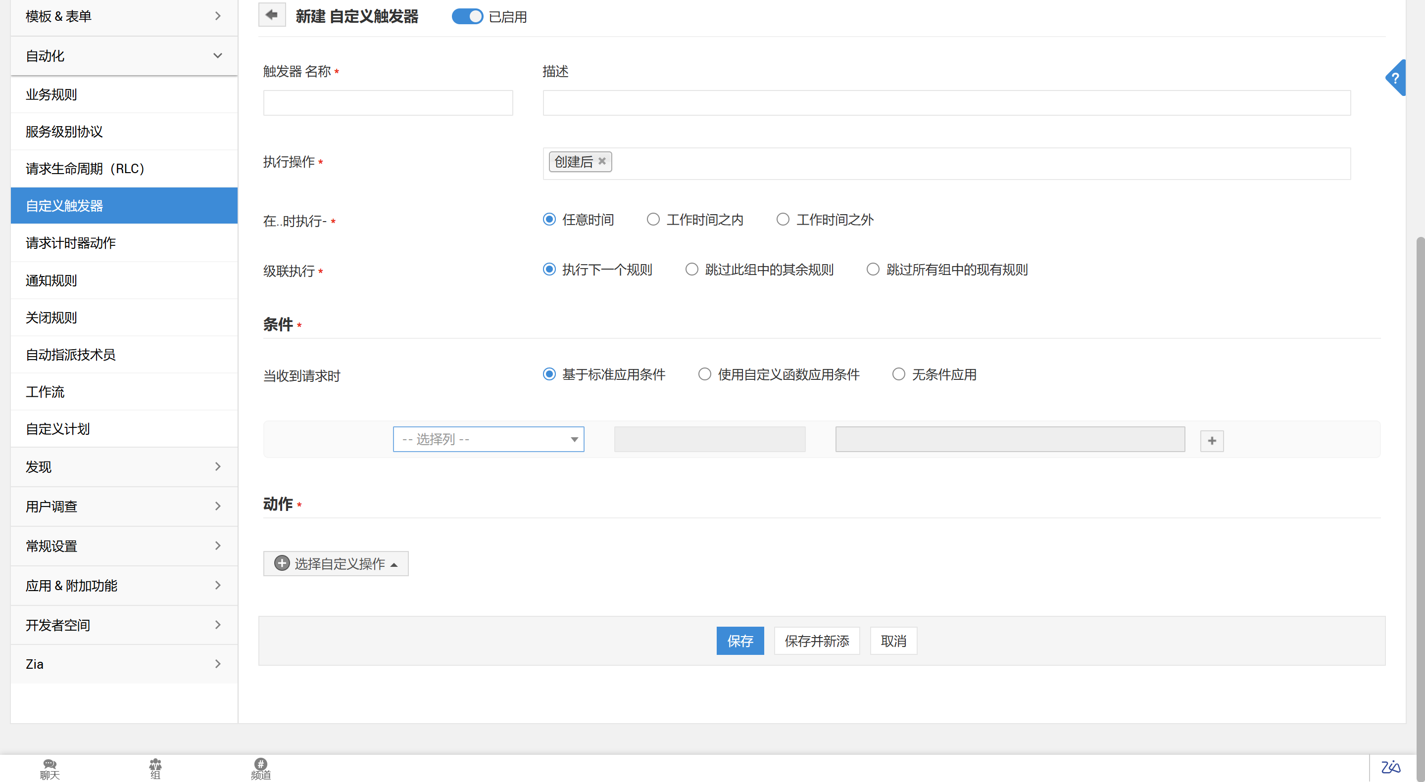 自定义触发器用于为符合某些预设标准的传入请求或记录配置自动操作。