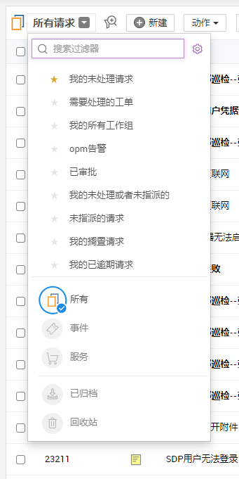通过选择正确的过滤器,您可以决定在看板视图中显示哪些请求。这一行为将决定您在后续的页面定制中所显示的请求,您可以访问左上角的请求过滤器下拉菜单: