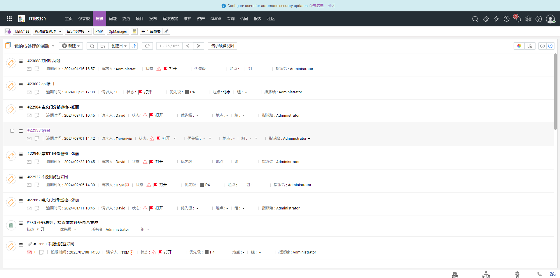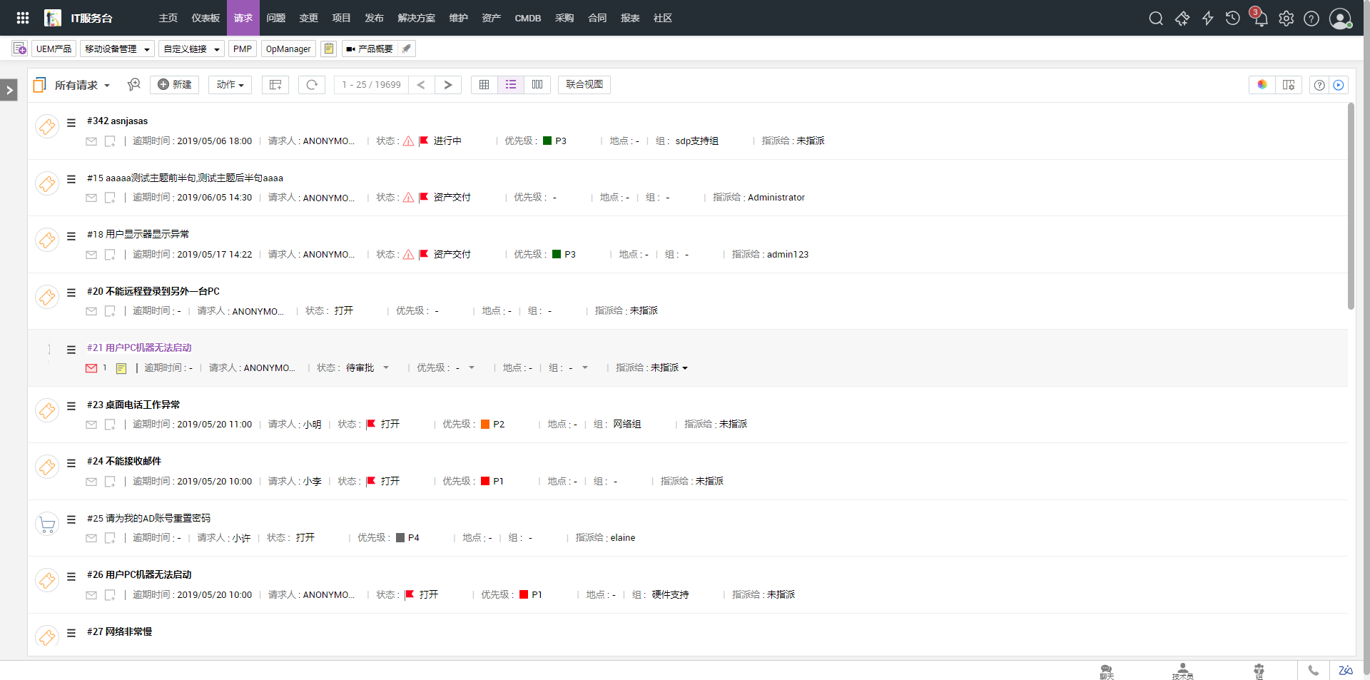 联合视图可让您在同一页面上跟踪请求和任务。该视图与经典视图相似,但筛选器和排序选项有限。