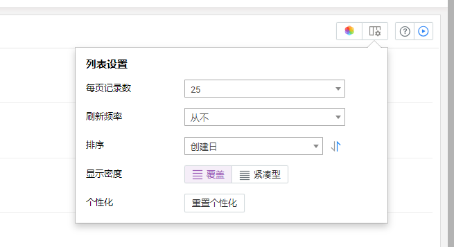 您可以在列表设置下通过配置每页记录、刷新频率、显示密度、列大小调整和个性化来定制列表视图。