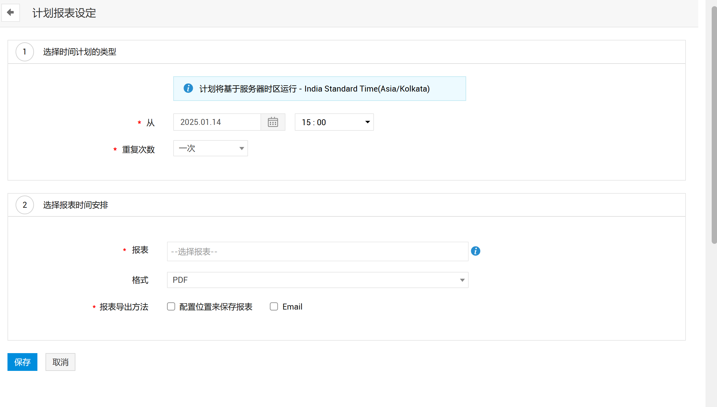 使用 "计划报表设置",可以在预定时间自动生成多种格式的报表。 这些报表可以 PDF、XLS、XLSX、HTML、Inline HTML、CSV、DOC、DOCX 或 XML 格式生成,并通过电子邮件共享或保存到服务器。
