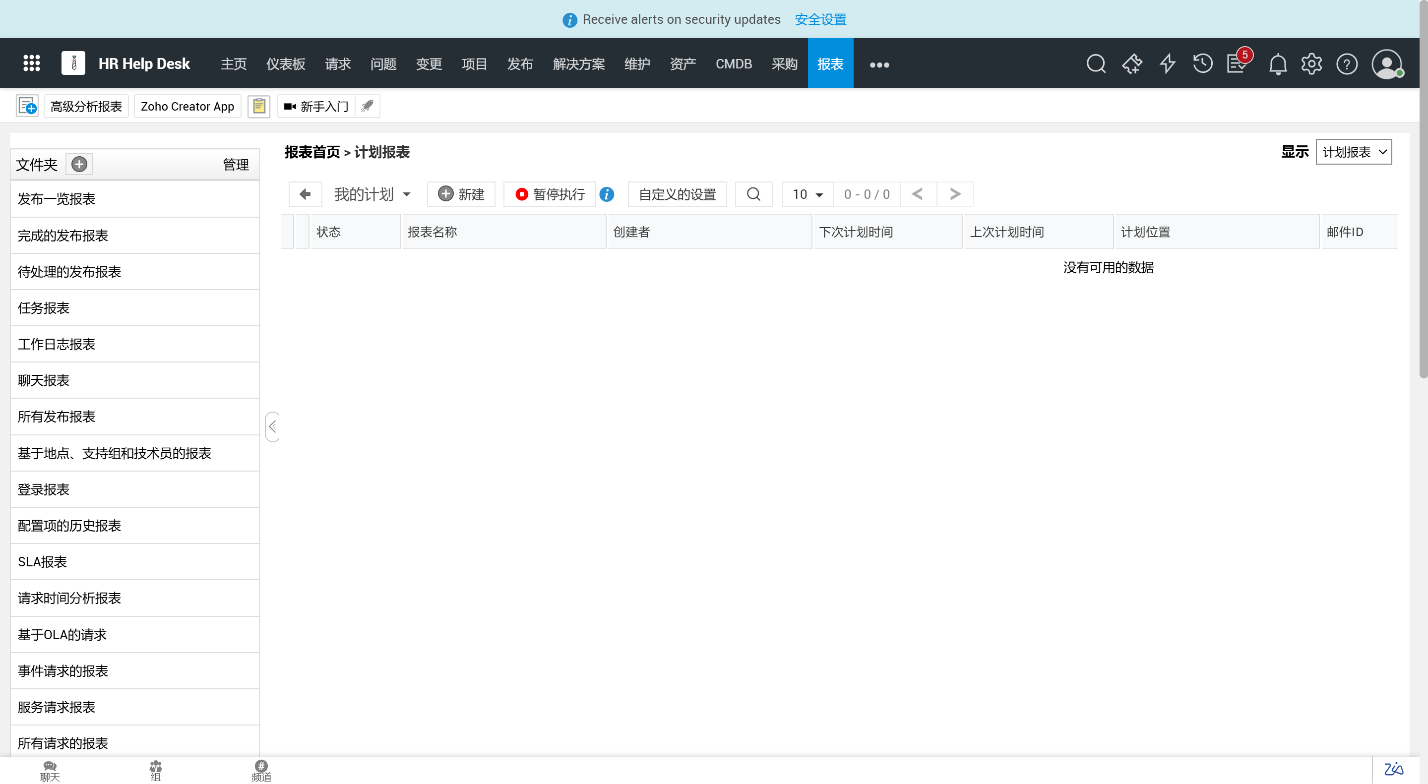 在计划报表列表视图中,您可以创建、启用、禁用、过滤、挂起、恢复、编辑或删除计划报表。要执行这些操作,请转到报表>显示>计划报表。