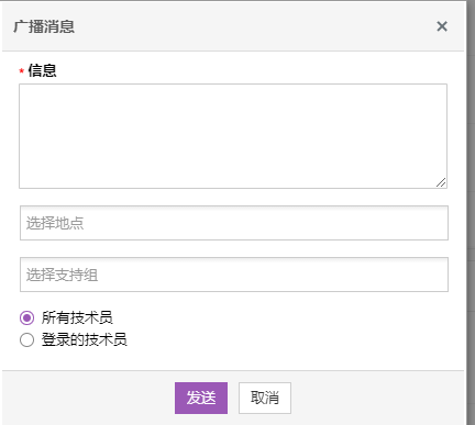 在打开的 "广播信息 "对话框中键入信息,选择是否要将信息发送到特定地点或组。如果要将信息发送给所有技术人员或仅发送给已登录的技术人员,请选择相应的选项并单击 "发送"。