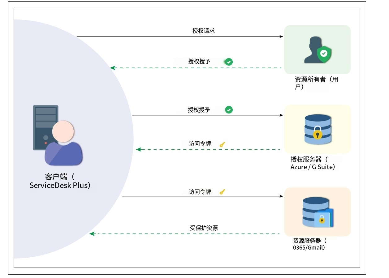 在这种情况下,ServiceDesk Plus 作为客户端请求访问邮件服务器(资源所有者)并获得授权许可。该授权许可由相应邮件箱(如 Gmail 的 G Suite 和 O365 的 Microsoft Azure)的授权服务器处理,经资源所有者审批后生成访问令牌。使用此访问令牌,ServiceDesk Plus 可以访问邮件服务器。