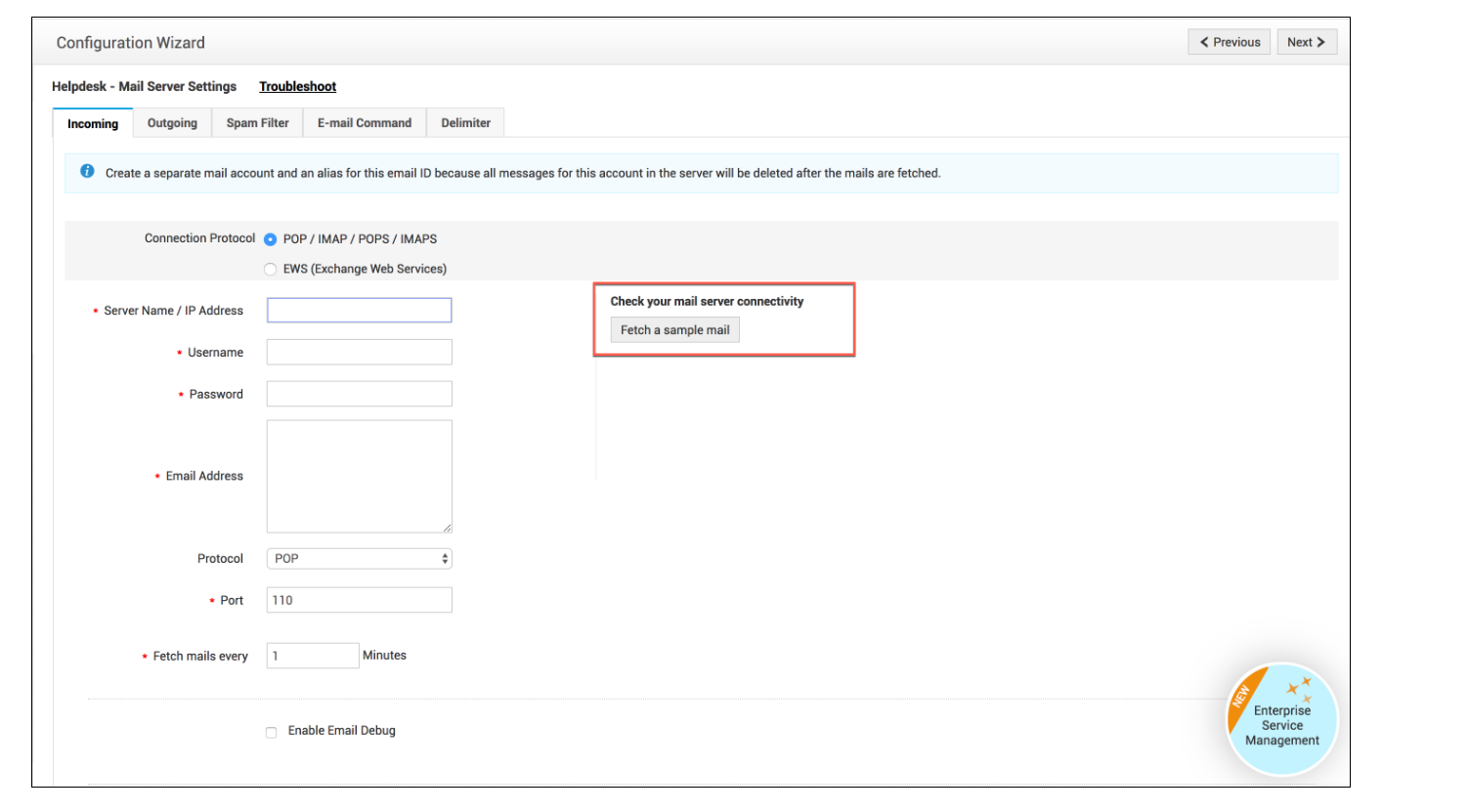 配置邮件服务器后,请通过获取示例邮件来测试设置。为此,请点击"获取示例邮件 "按钮。