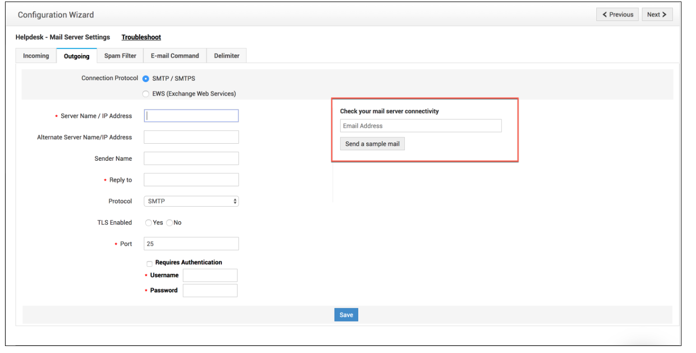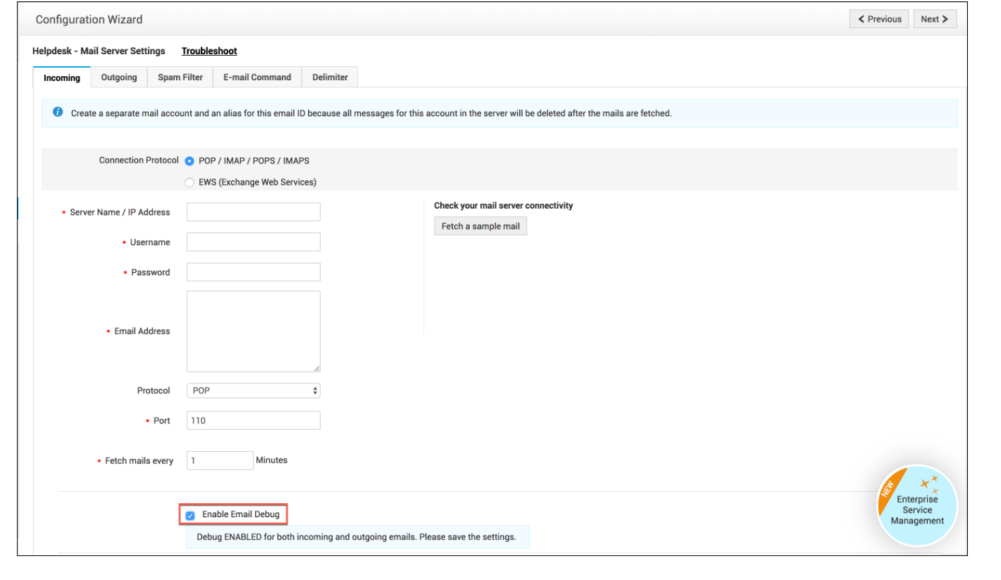 如果第三方应用程序没有连接问题,只有 ServiceDesk Plus 存在身份验证问题,请启用电子邮件调试并发送日志以供分析:
