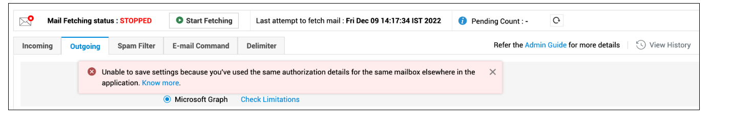 邮件节流限制会针对每个应用程序 ID 和邮箱组合进行评估。ServiceDesk Plus 阻止用户在同一服务台实例或跨实例中为接收邮件服务器设置和发送邮件服务器设置配置相同的客户端 ID 和回复电子邮件。