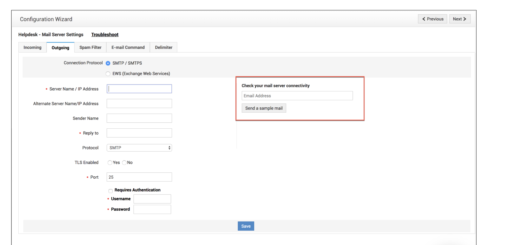 如果第三方应用程序没有连接问题,只有 ServiceDesk Plus 存在身份验证问题,请启用电子邮件调试并发送日志以供分析: