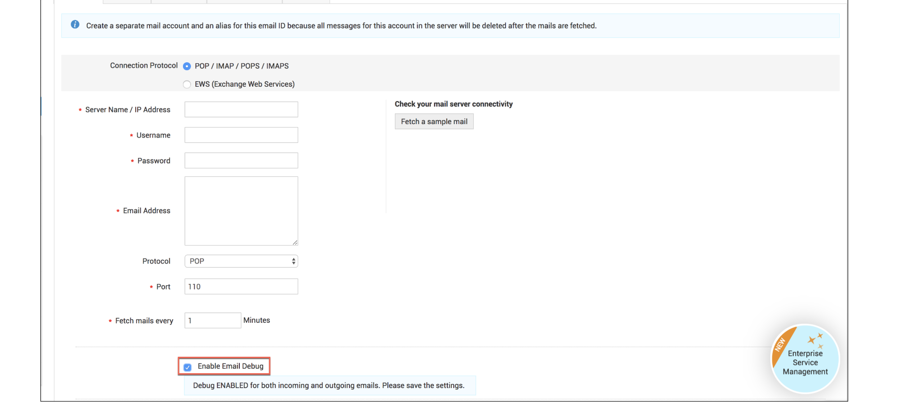 - 要调试电子邮件,请选中启用电子邮件调试复选框并保存设置。
