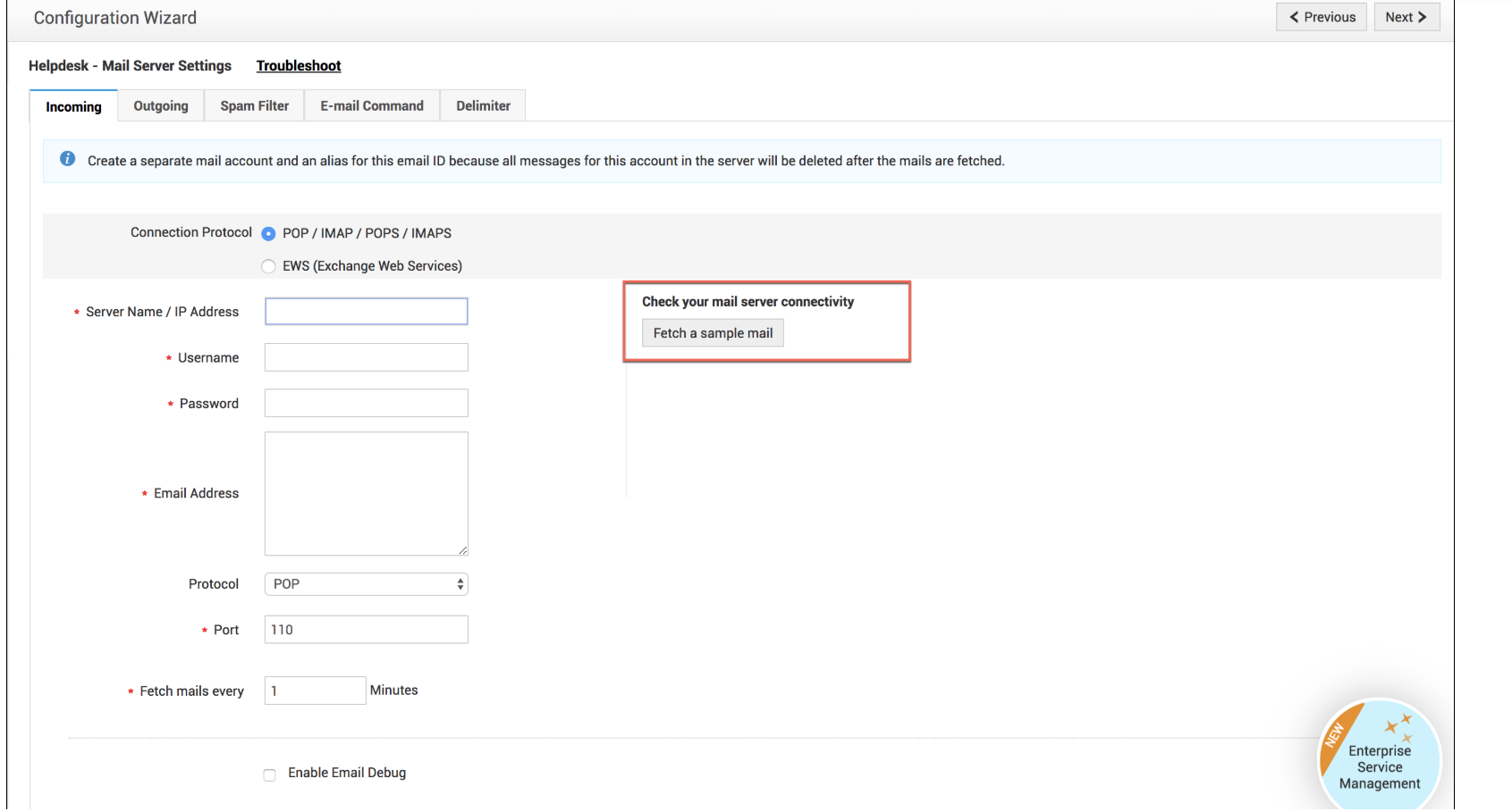 配置完邮件服务器后,通过获取示例邮件来测试设置。 为此,请点击获取示例邮件按钮。