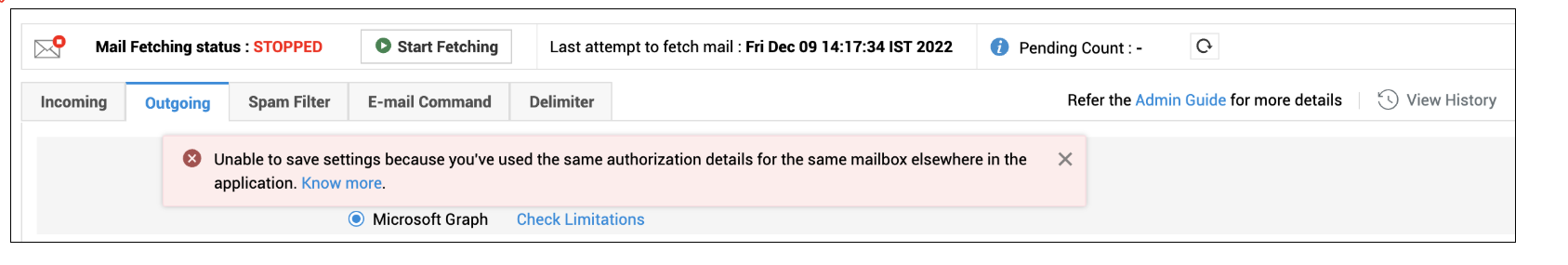 邮件节流限制针对每个应用程序 ID 和邮箱组合进行评估。 ServiceDesk Plus 可防止用户在同一服务台实例或跨实例中为收件和发件邮件服务器设置配置相同的客户端 ID 和回复邮件。