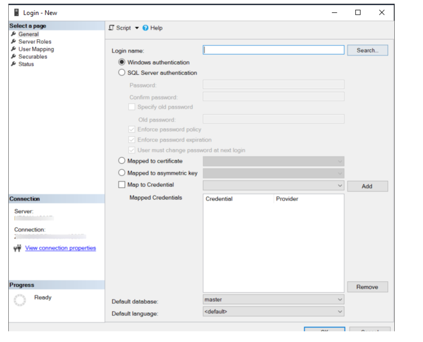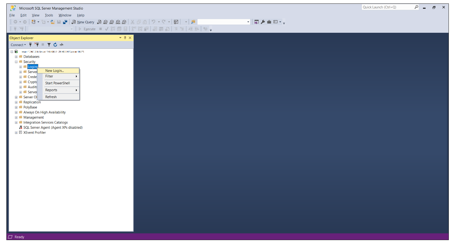 在对象资源管理器下,右键单击登录并选择新建登录。