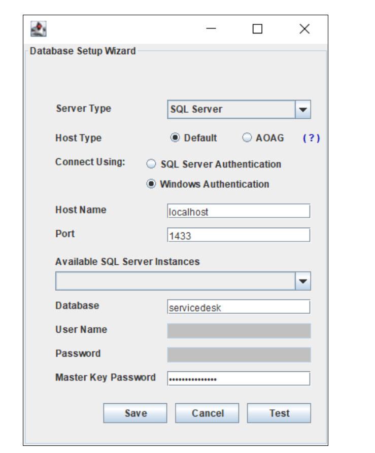 执行 <ServiceDesk Home>\bin 目录下的 changeDBServer.bat [changeDBServer.sh for Linux] 文件,打开数据库设置向导,填写相应的服务器详细信息:
