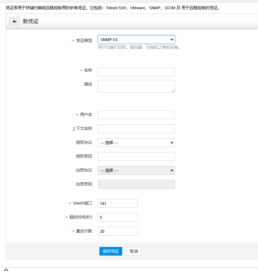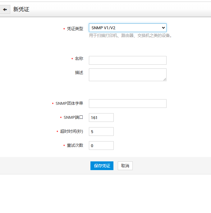 SNMP V1/V2 凭证用于扫描打印机、路由器和交换机等网络设备。
