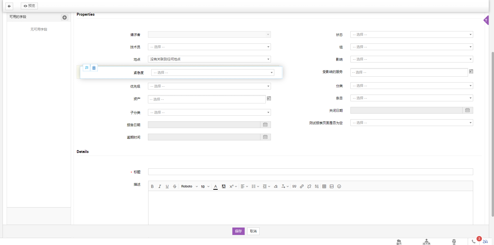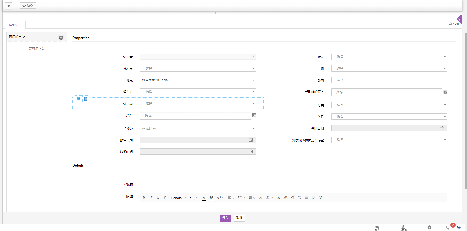 画布 | 包含捕捉必要问题信息的字段。有些字段是系统定义的,不能删除。所有其他字段都可以添加/删除。 此外,您还可以在画布中定义字段/节属性。 - 编辑字段/分段- 将鼠标悬停在字段/分段上,然后点击