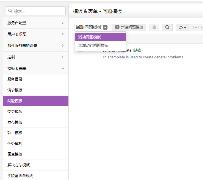- 转到管理 > 模板和表单(旧用户界面中的问题/变更管理) > 问题模板。