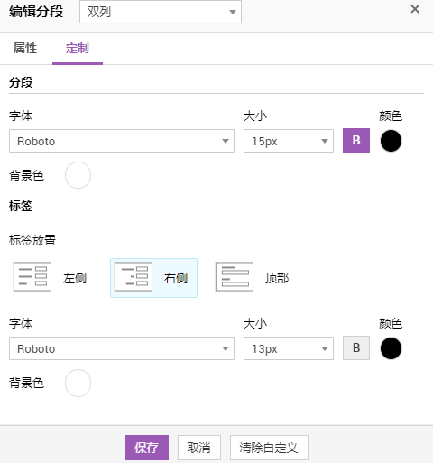 - 分段(不适用于字段自定义)- 变更字体、字号和颜色以及背景颜色。还可以将标题加粗。