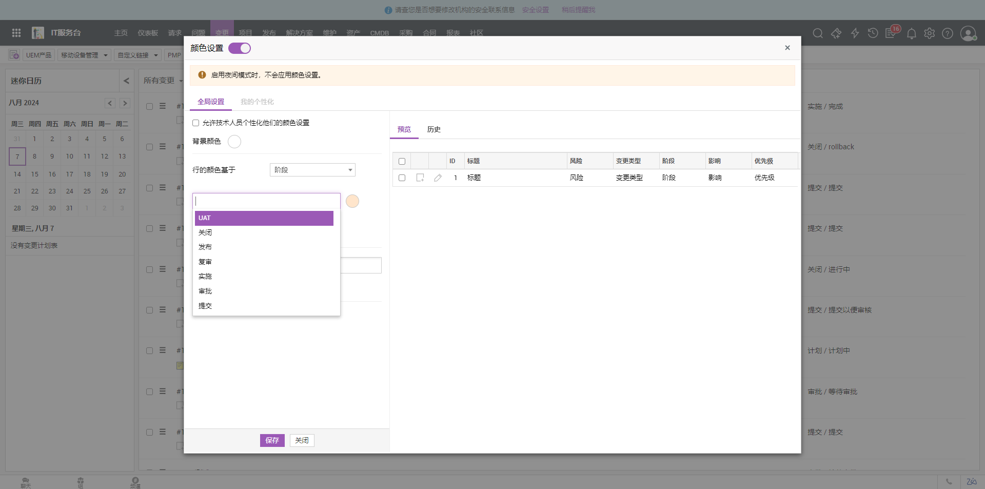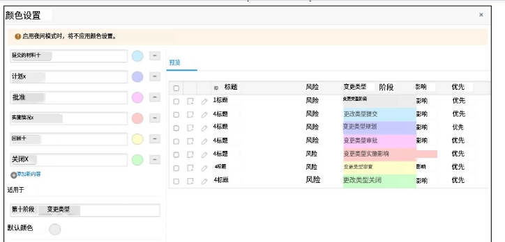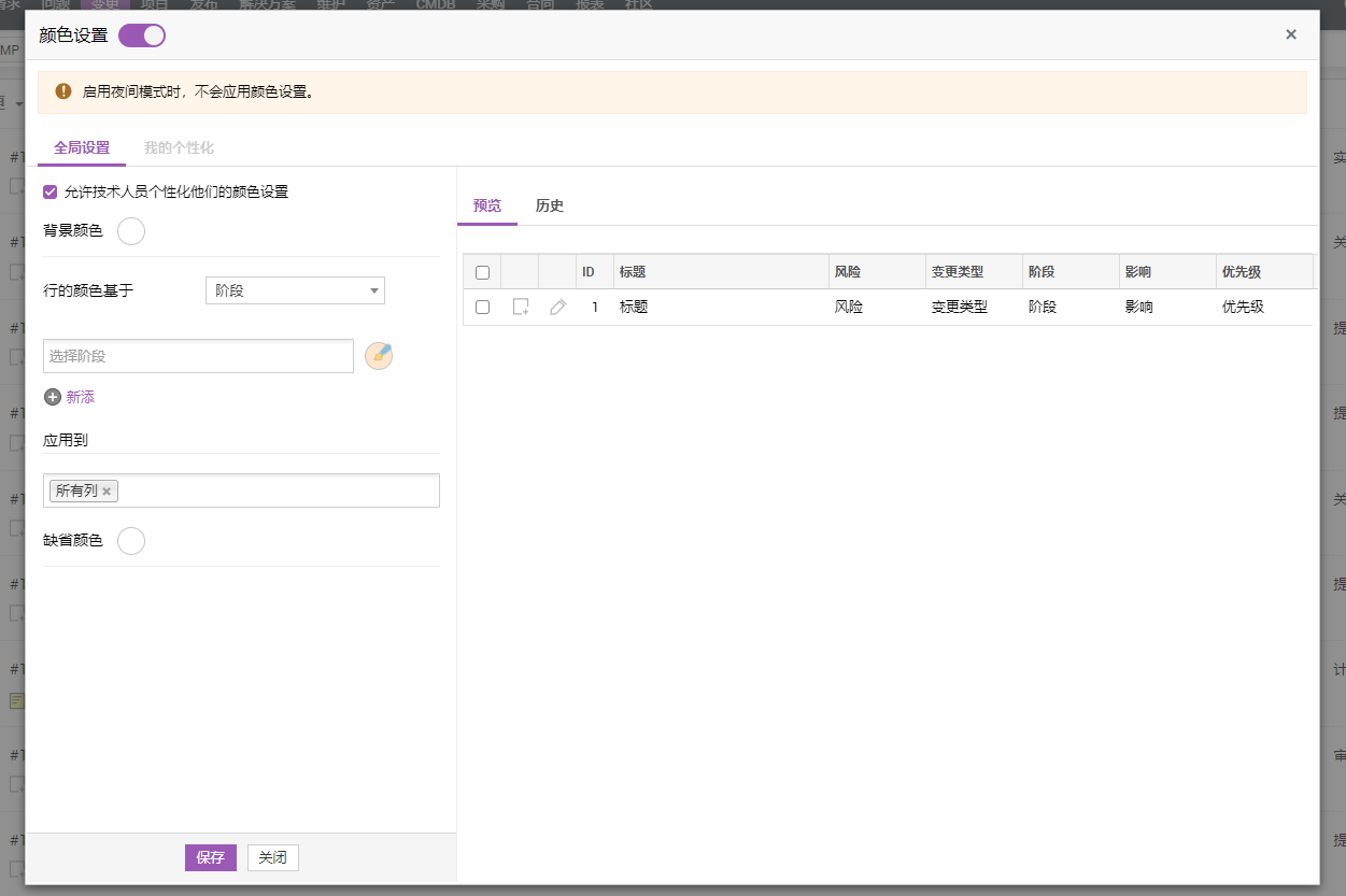 如果管理员为技术人员启用了权限,他们可以在登录时个性化更改颜色设置。个性化颜色设置将覆盖变更列表视图和经典视图中的全局颜色设置。
