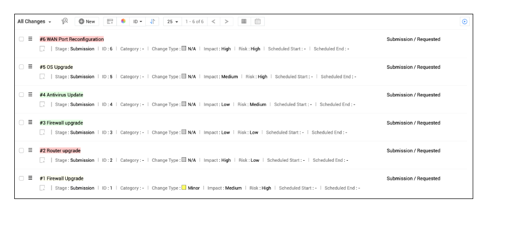 根据风险、阶段、影响、优先级、类别和紧迫性等变更属性,在列表视图和经典视图中对变更请求进行颜色编码。这样,技术人员就能轻松识别和跟踪变更请求。