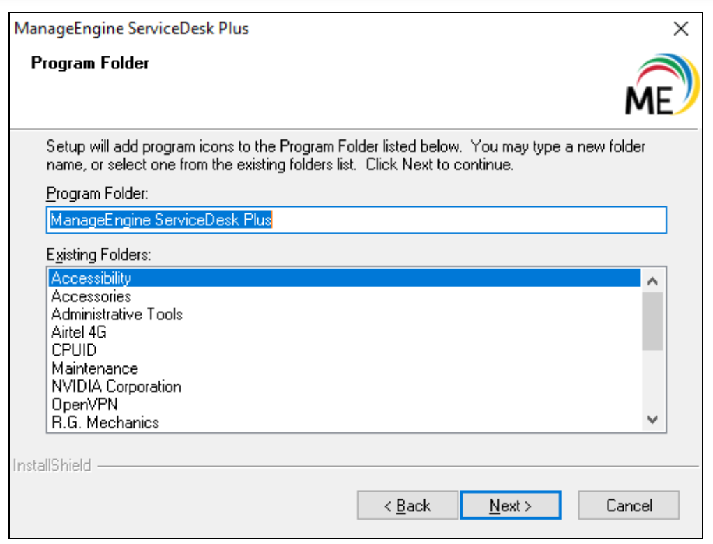 ManageEngine ServiceDesk Plus 将作为程序文件夹在开始菜单中的默认名称。不过,您可以重命名该文件夹或选择其他文件夹,如下所示: