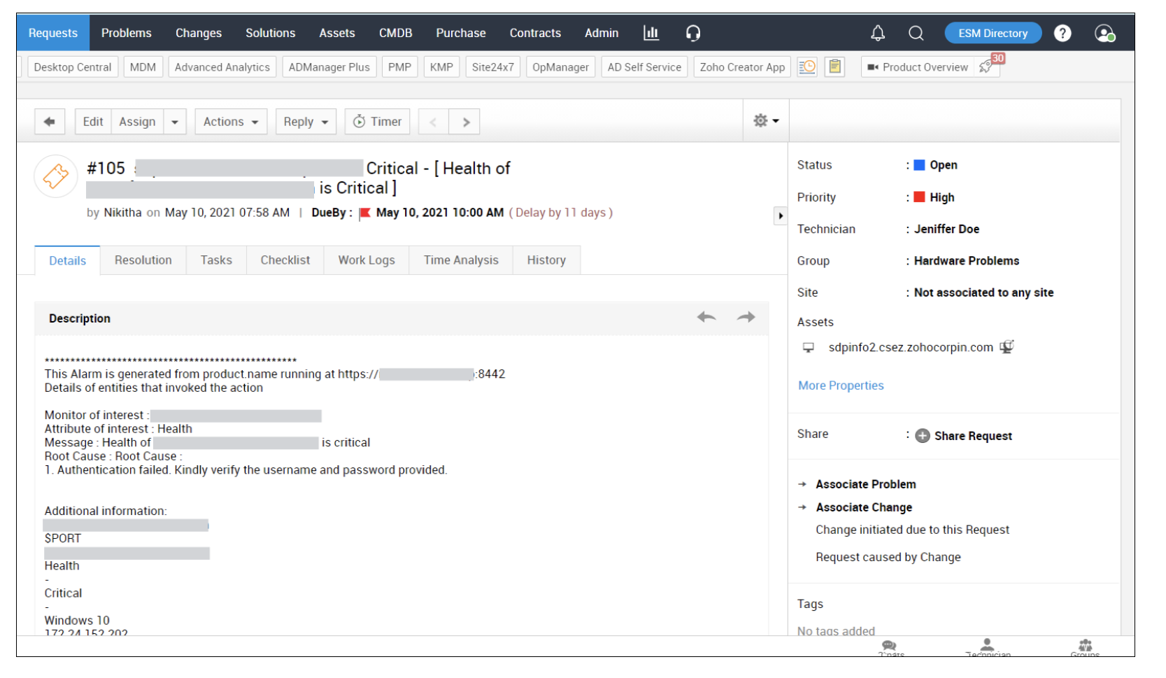 集成后,您可以在 ServiceDesk Plus 中自动将 AlarmsOne 中的警报作为事件请求共享。 您可以根据警报类别、应用程序或关键性为事件分配类别、优先级或支持组。 作为请求共享的警报可按标签分组,便于查找。