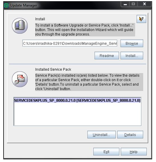 要卸载补丁:sh UpdateManager.sh -u <ServiceDesk_Home>\conf -c -option u -h <Product Home> -version <Patch version>